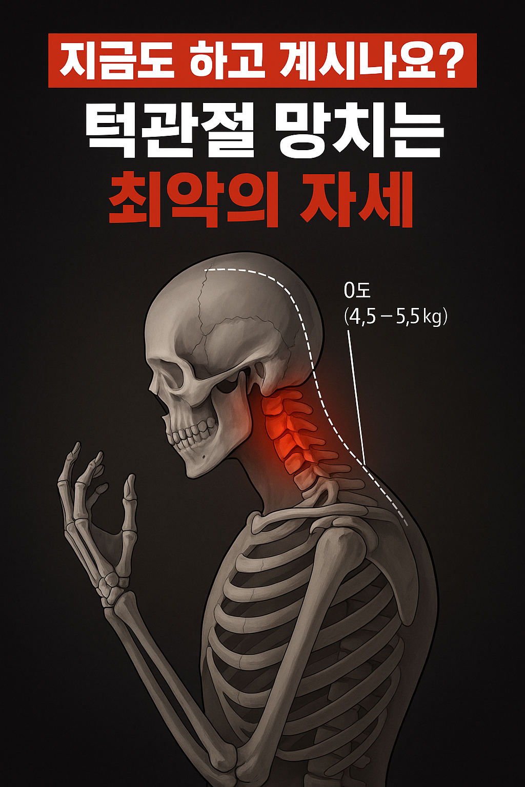 스마트폰을 들여다보다 보면 어느새 고개를 푹 숙이고 있는 자신을 발견하게 됩니다. 이때 목이 앞으로 기울어지는 각도가 60도에 가까워지면, 머리 무게는 무려 27kg까지 증가합니다. 이는 쌀 20kg 포대보다도 무거운 무게입니다. 그 무게를 그대로 목과 어깨, 턱 아래 근육이 지탱하고 있는 것이죠.